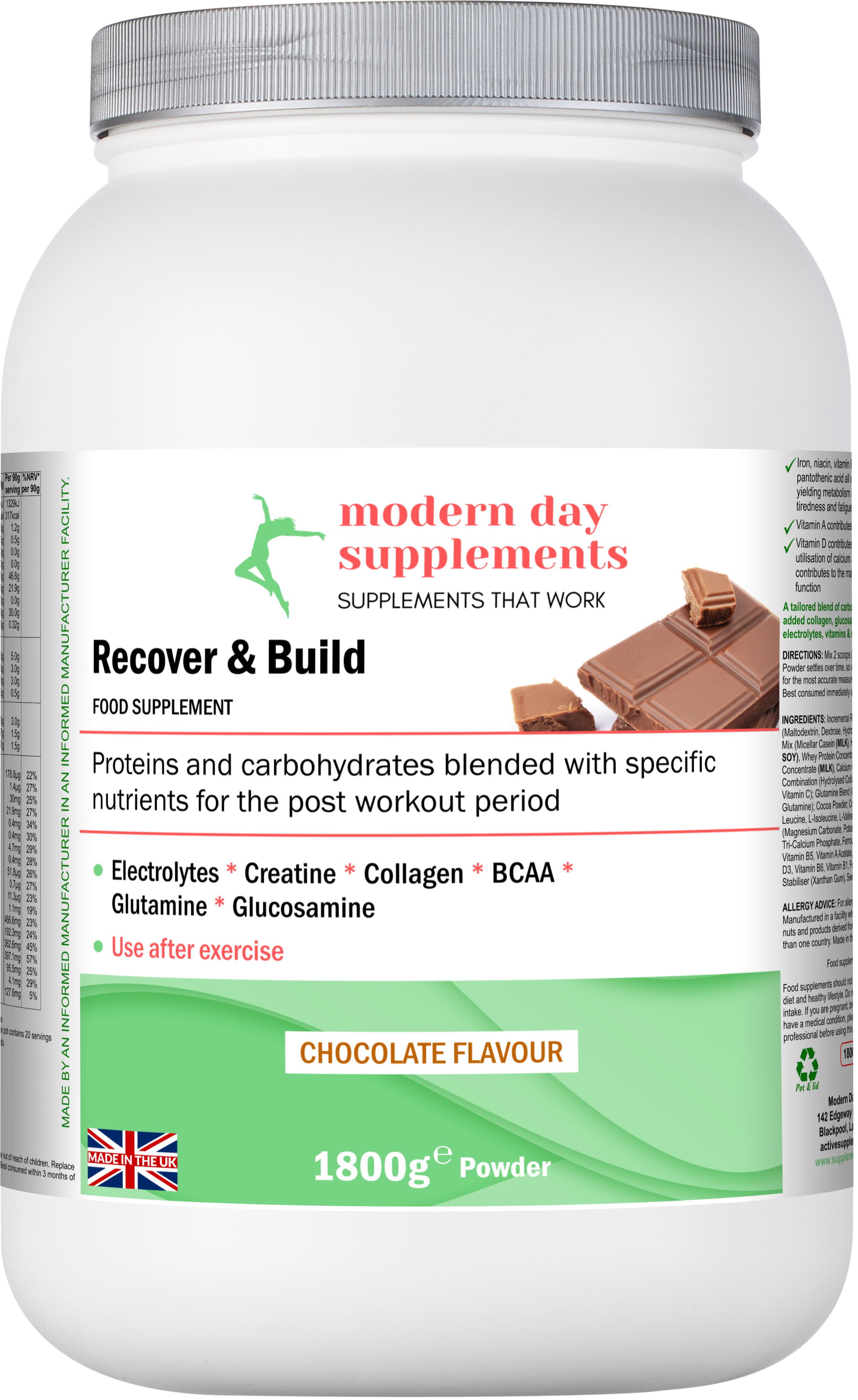 When it comes to post-workout recovery and muscle building, there are several key factors to consider. This Recover & Build formula is for improved recovery, phased energy replenishment, and rehydration, It is a lovely chocolate flavour drink mix, specifically formulated for this crucial point of exercise.